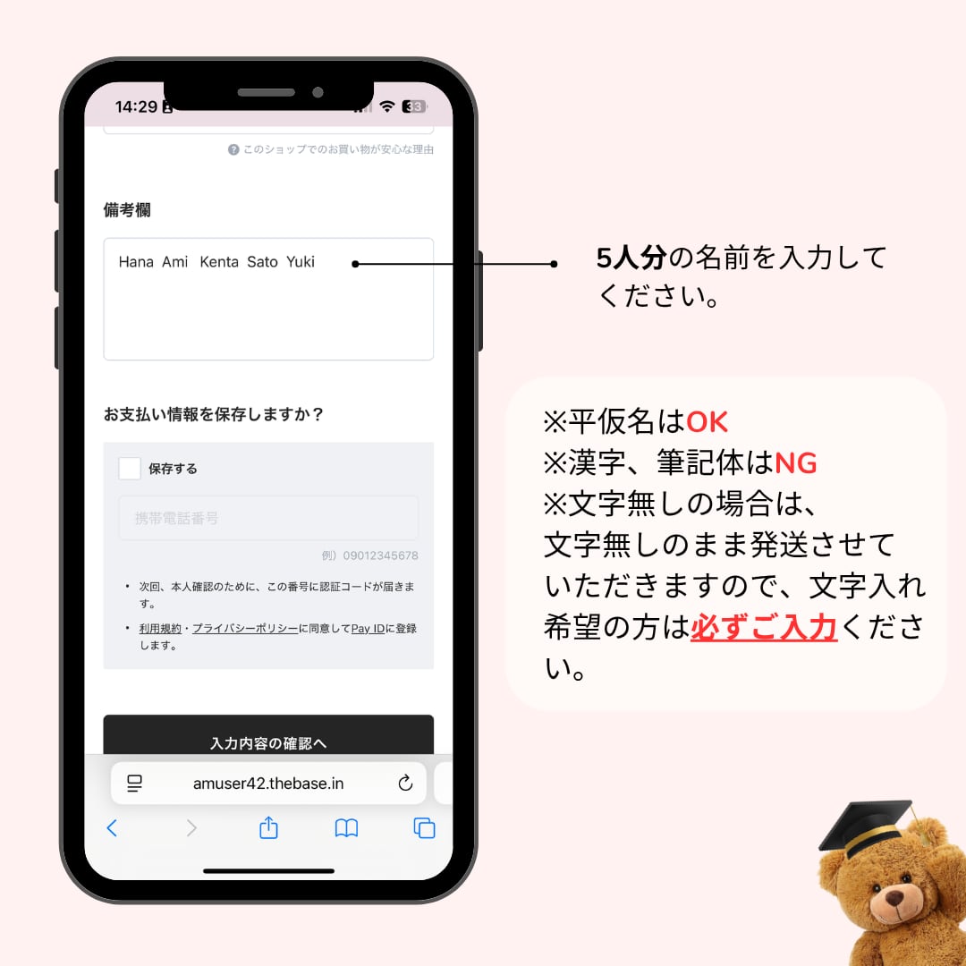 ※**ご入力いただいた内容をそのまま印字いたします。**スペルミスや表記の誤りがないようご確認をお願いいたします。