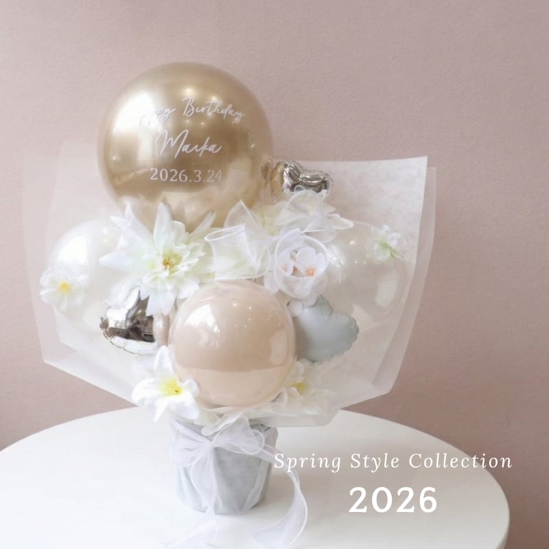 上品なゴールドカラーとやさしいホワイトフラワーで仕上げた、大人かわいいバルーンアレンジメント。